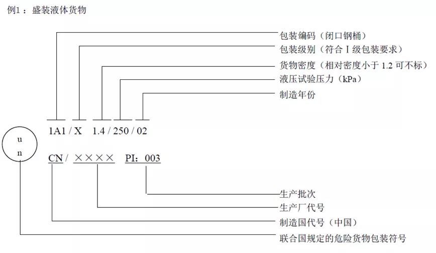 每一個包裝容器必須帶有持久、易辨認以及與包裝規格相比大小適當的明顯標記,對于毛重超過30kg或體積超過30L的包裝,在其頂部或邊上必須有標記;標記字母、數字和符號的高度必須≥12mm。包裝件毛重小于等于30kg或體積小于等于30L時,標記字母≥6mm。5kg或5L以下的包裝也必須有適當大小的標記。